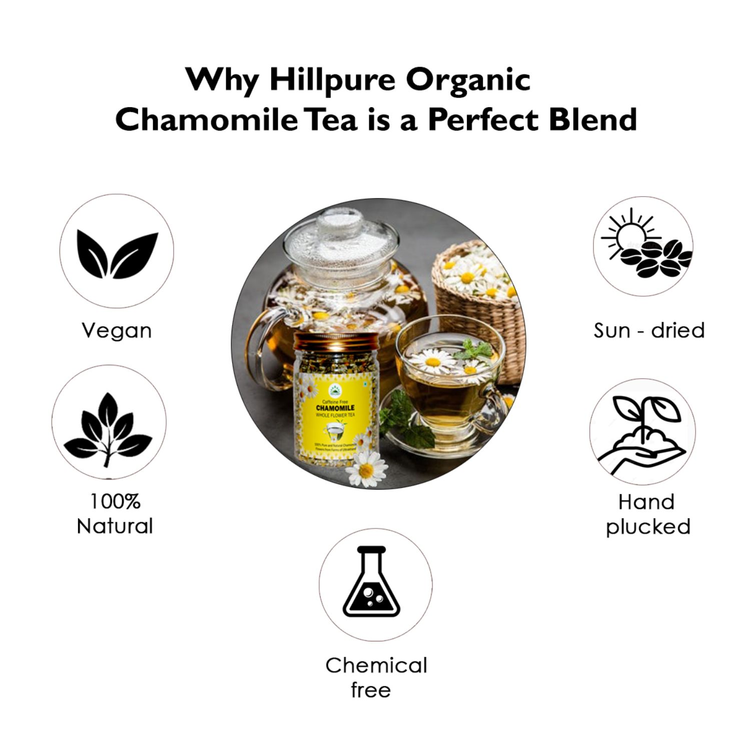Hillpure Organic Chamomile Whole Flower Tea, Caffiene Free, Stress Relief, Soothing Tea, 100 % Pure & Authentic, From Uttarakhand Hills (50 + 50gm), Pack of 2