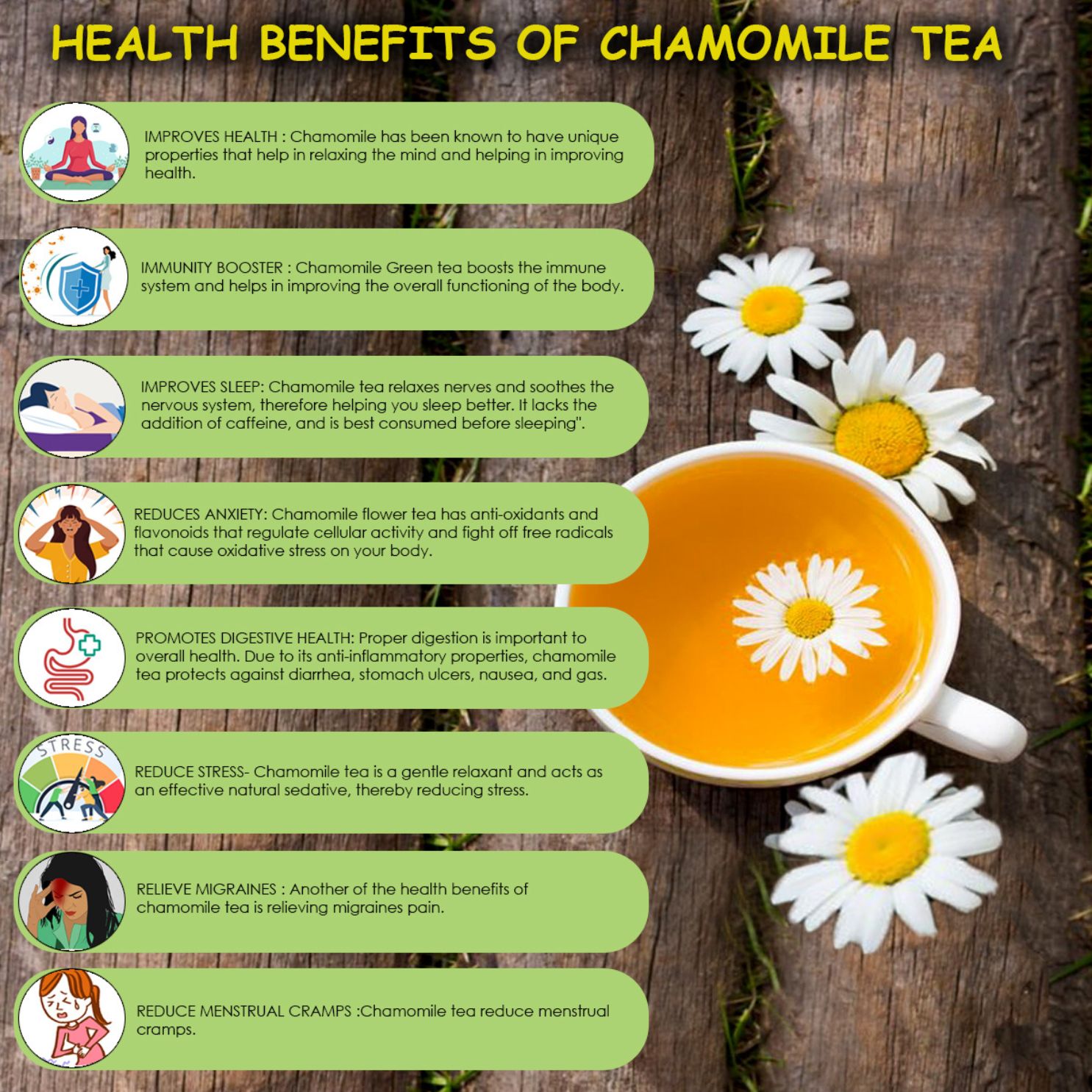 • IMMUNITY BOOSTER : Chamomile Green tea boosts the immune system and helps in improving the overall functioning of the body.