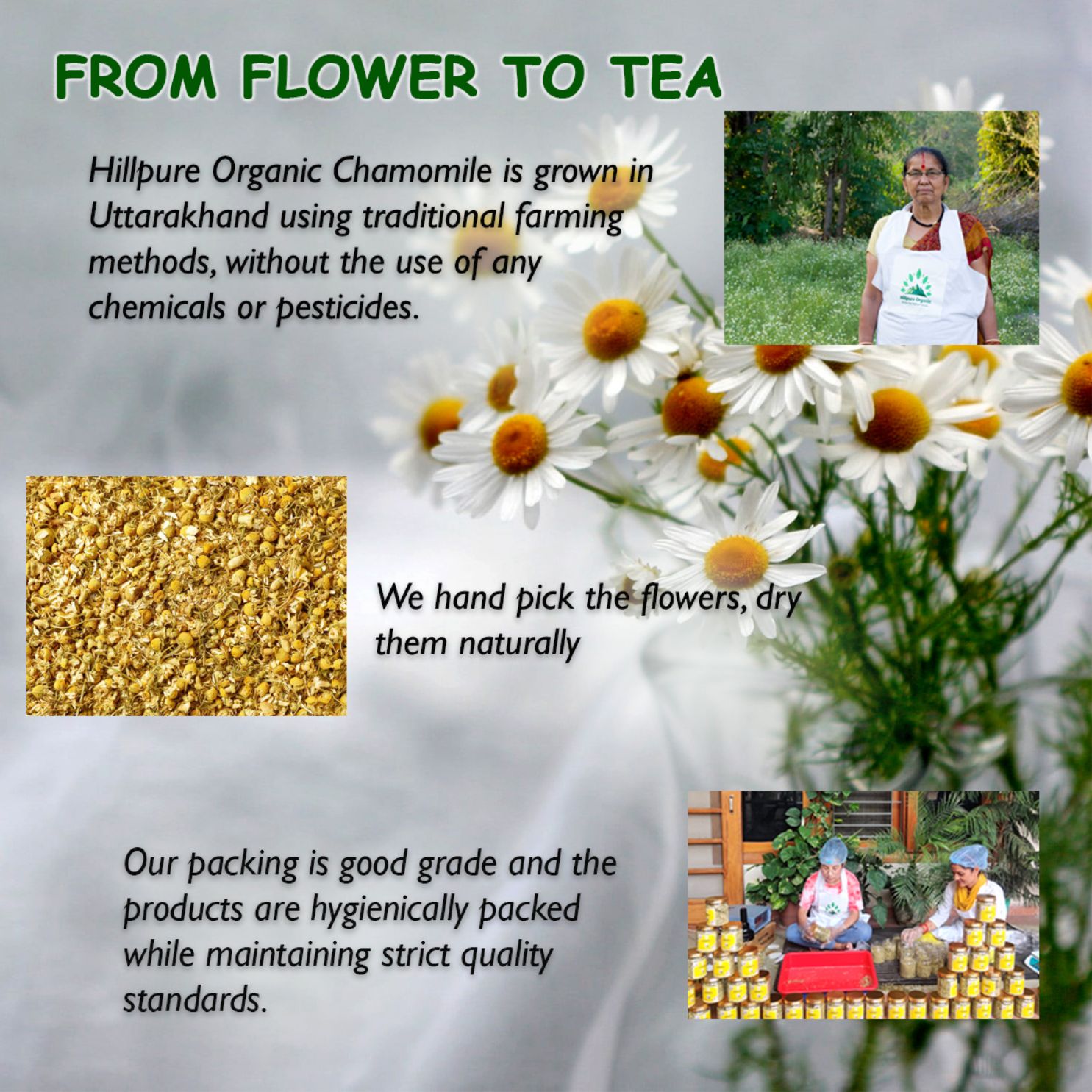 “Hillpure Organic Chamomile is grown in Uttarakhand using traditional farming methods, without the use of any chemicals and pesticides. We hand pick the flowers, dry them naturally and pack the whole flowers for tea. Chamomile tea may help to reduce anxiety, improve sleep quality, boost immune system, improves skin and heart health and may relieve digestive issues.”