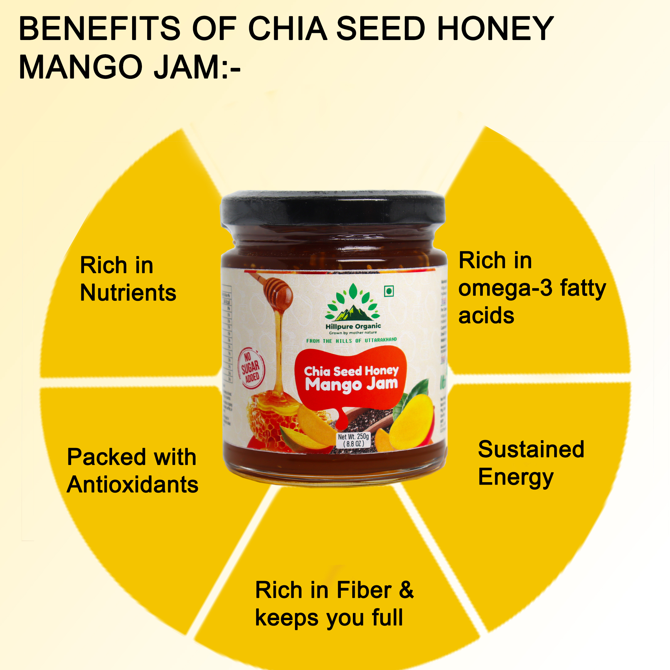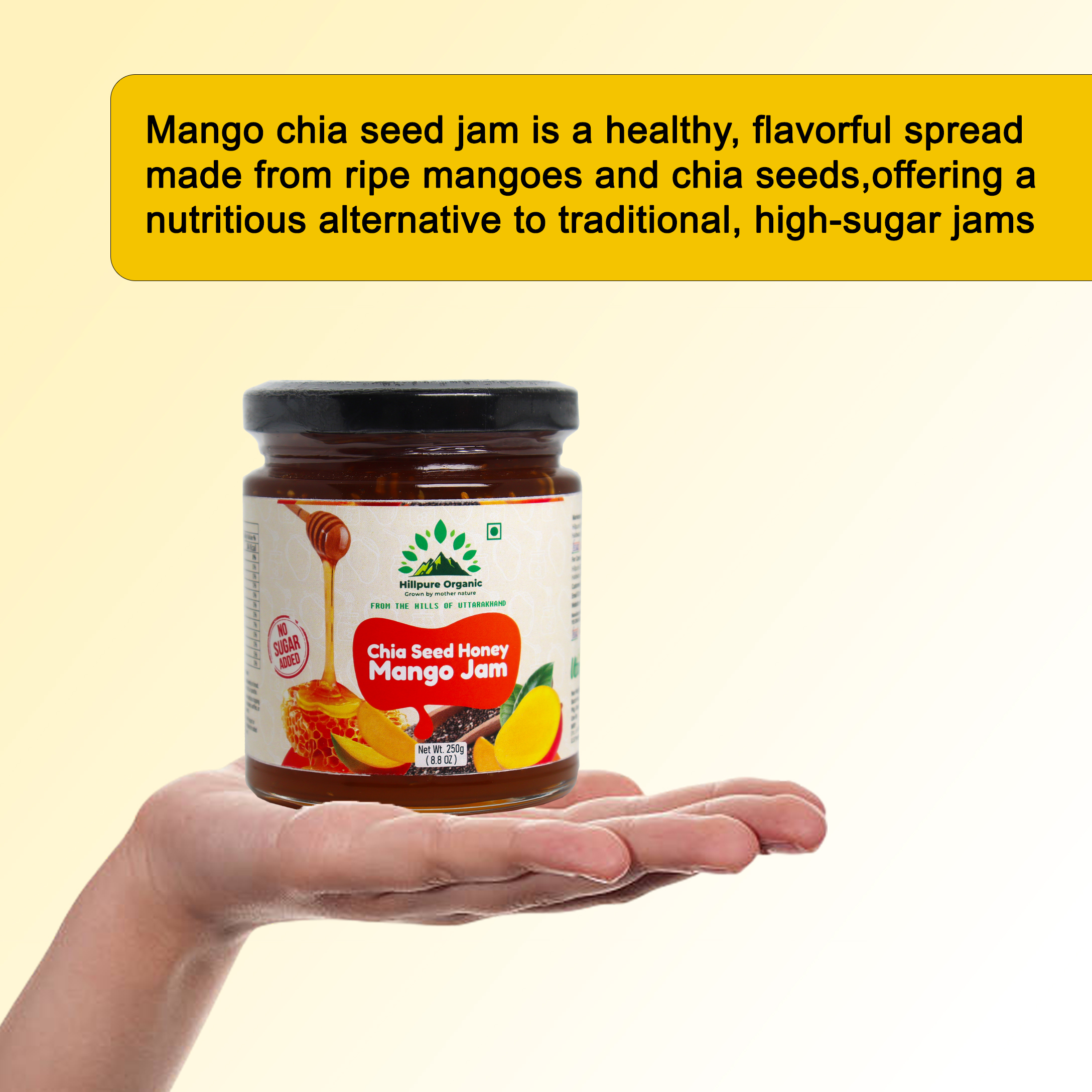 Hillpure Oranic Chia Seed Honey Mango Jam is a delicious blend of pure honey, ripe mango pulp, and nutrient-rich chia seeds. Crafted without refined sugar or artificial additives, this jam delivers the authentic sweetness of mango balanced with the smooth richness of honey. The soft crunch of chia seeds adds texture and makes this spread both enjoyable and wholesome. Ideal for breakfast and snacking, it pairs beautifully with bread, parathas, pancakes, yogurt, oats, and desserts. Prepared in small batches to maintain freshness and quality, this honey-based mango jam is a perfect choice for those seeking clean, natural, and flavourful food options.