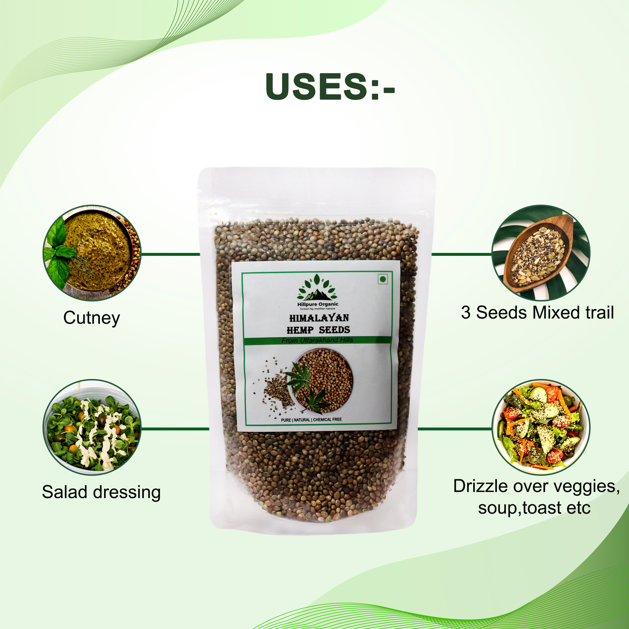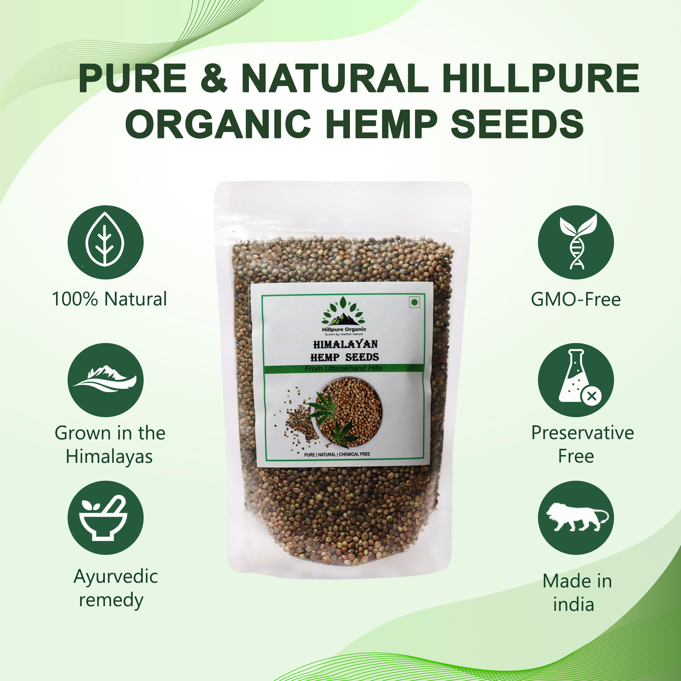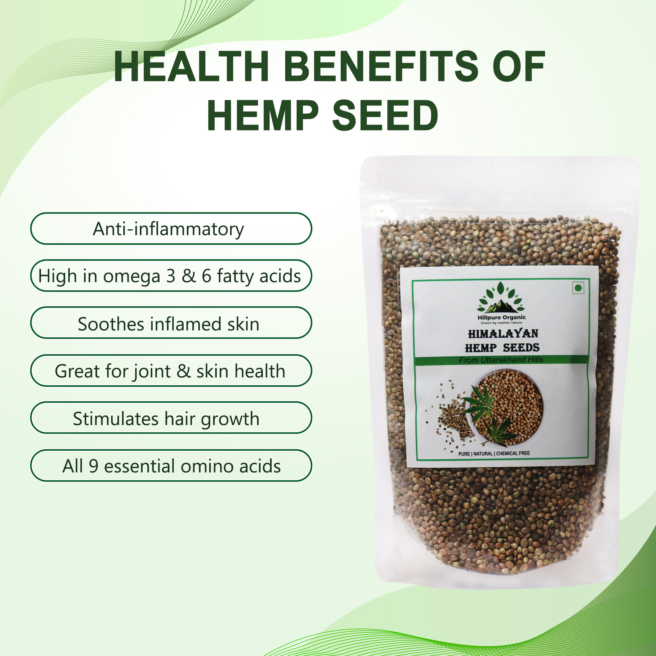 Hillpure Organic Hemp Seed is 100 % Natural & raw. Its traditionally collected from hilly areas of uttarakhand. hemp seeds are great source of plant-based protein Hemp seeds are a highly nutritious and its food Fiber plays a role in lowering your cholesterol levels, which is important for a healthy heart. Hemp seeds also contain other nutrients that can help in the health of this vital organ, such as omega-3 and omega-6 fatty acids, as well as the amino acid arginine.