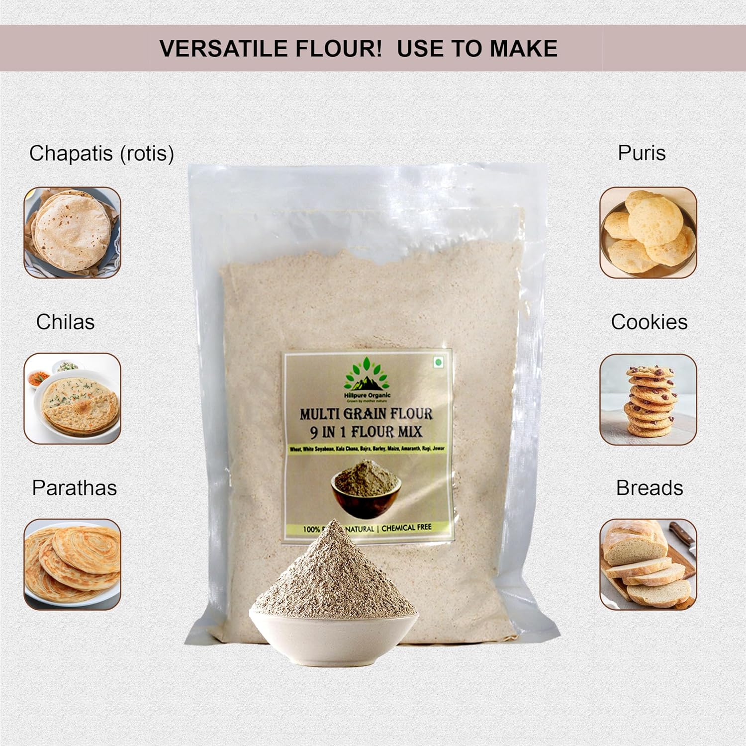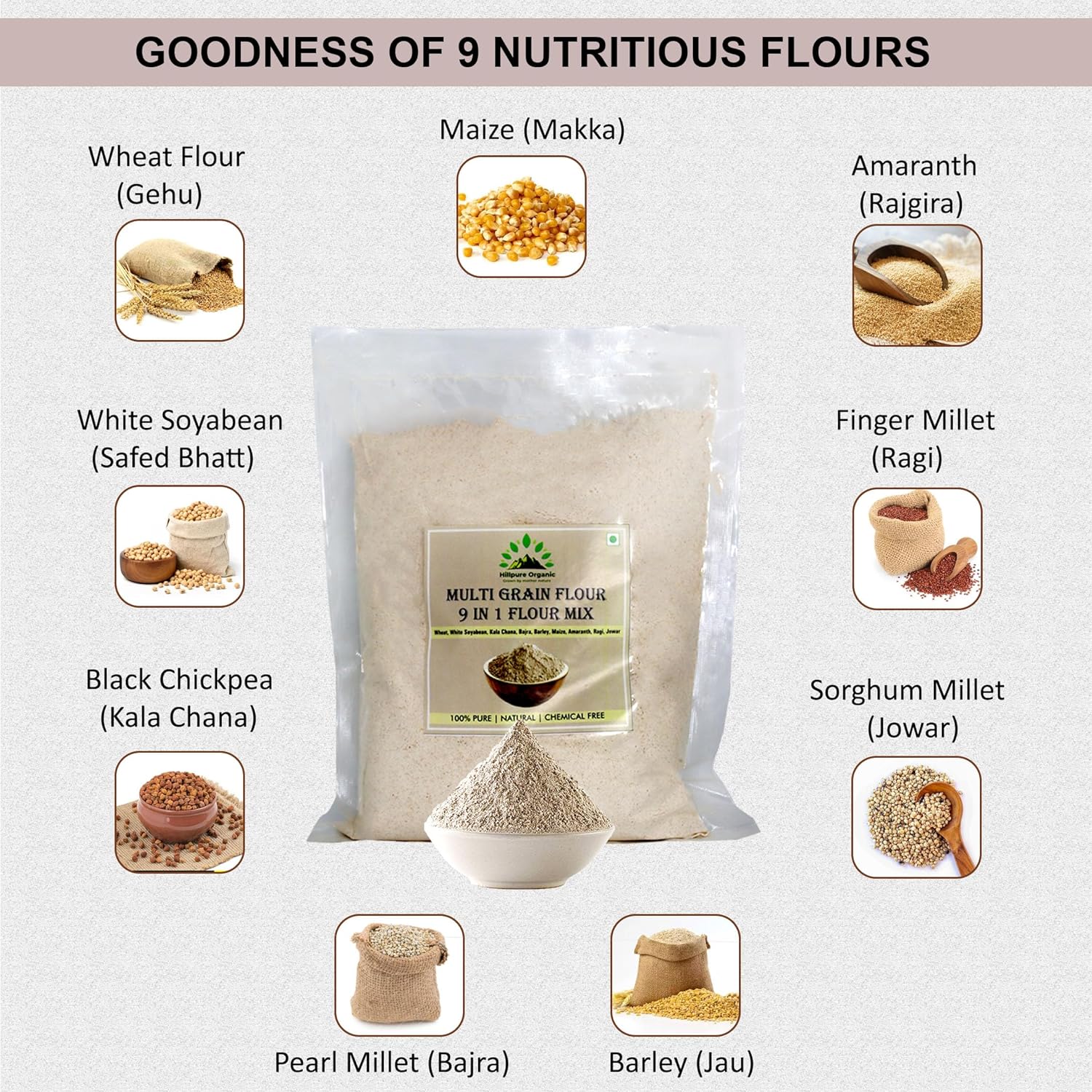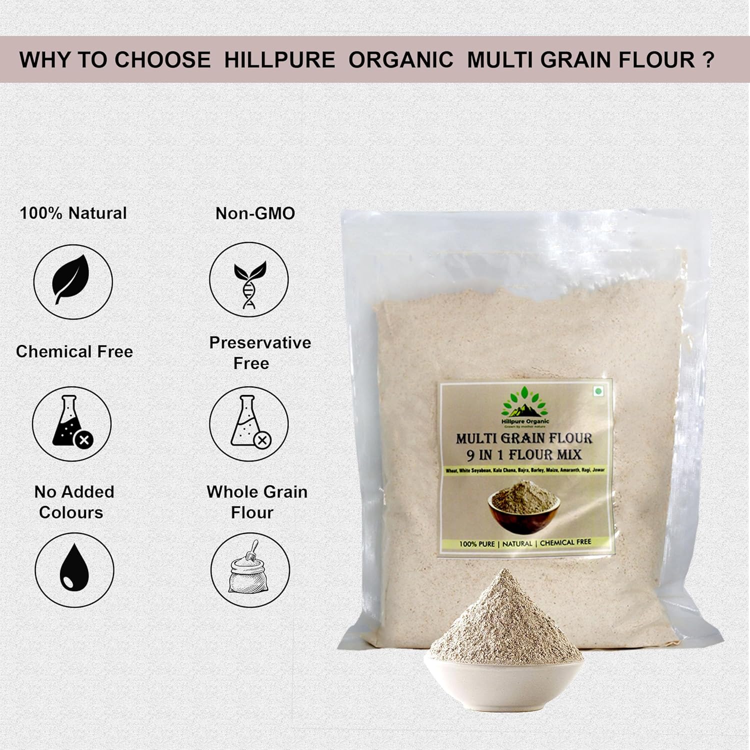 Hillpure Organic Multigrain Flour is a nutritious mix of 9 grains including – Wheat(Gehu), White Soyabean (Safed Bhatt), Black Chickpea (Kala Chana), Pearl Millet (Bajra), Barley (Jau), Maize (Makka), Amaranth (Rajgira), Finger Millet (Ragi) and Sorghum (Jowar). Each of these grains has its unique nutrient profile which improves the range of nutrient supply, taste and texture of the flour. All these grains are grown without the use of chemicals and fertilisers. The flour is Non-GMO, preservative free, clean, and has no artificial colours and additives to offer the most trustable quality!