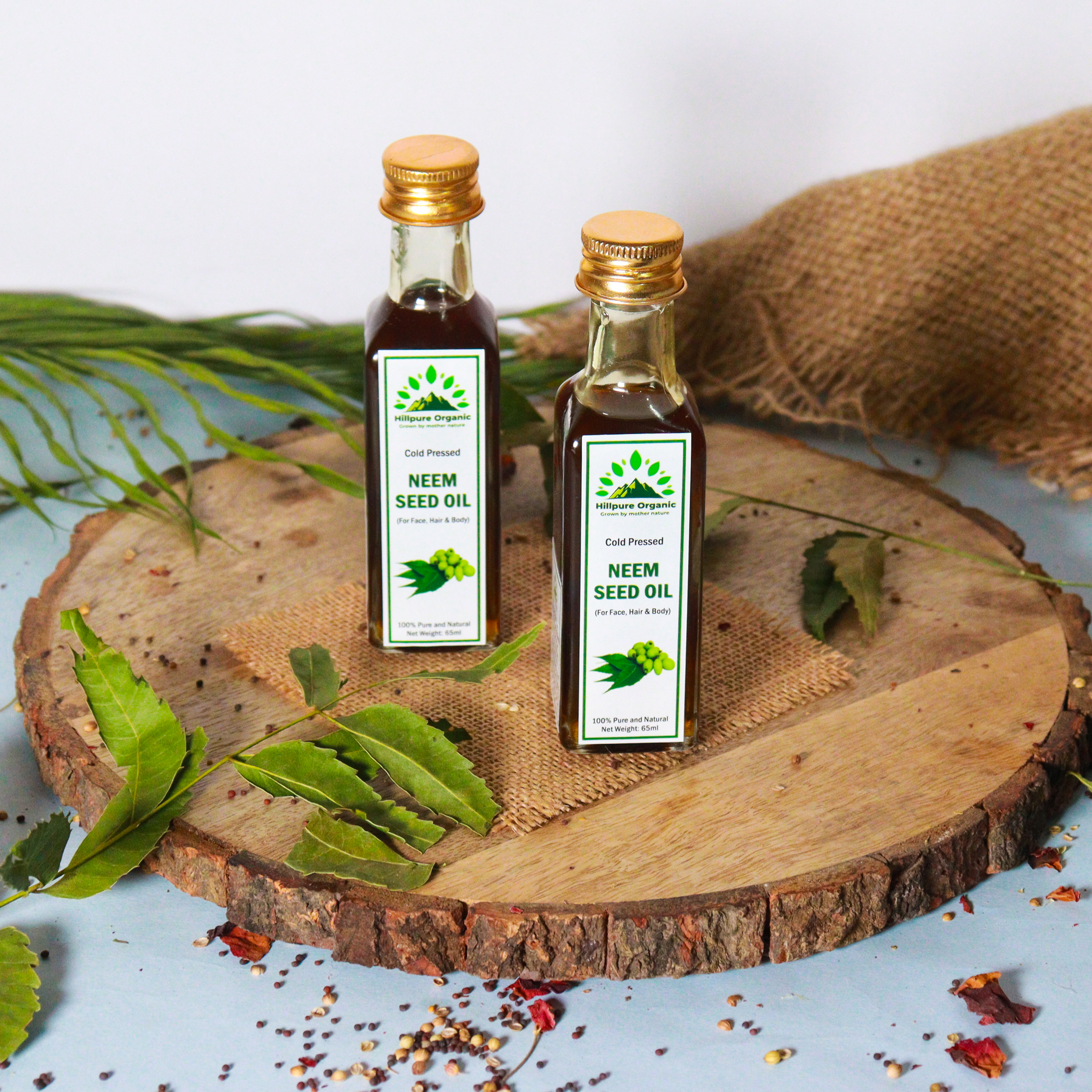 Hillpure Organic Premium Cold Pressed Neem Seed Oil,100% Pure & Natural for Face, Hair & body (65 + 65 ml, Glass Bottle), Pack of 2